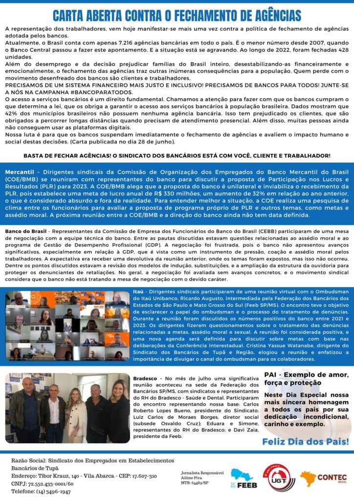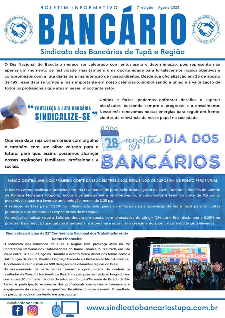 BOLETIM BANCÁRIO/AGOSTO 2023Boletim BancárioCompartilhe esta notícia Whatsapp Facebook Twitter Linkedin Telegram Email